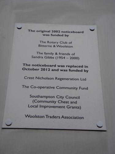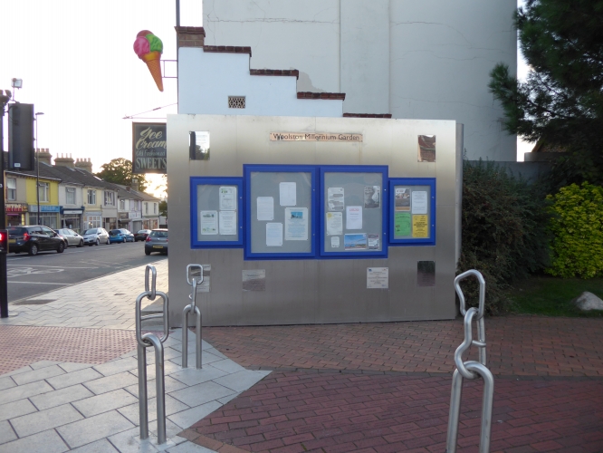 September 2016 Notice board with new "Art Deco" style shop behind |