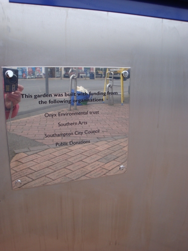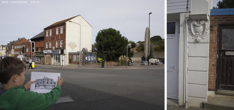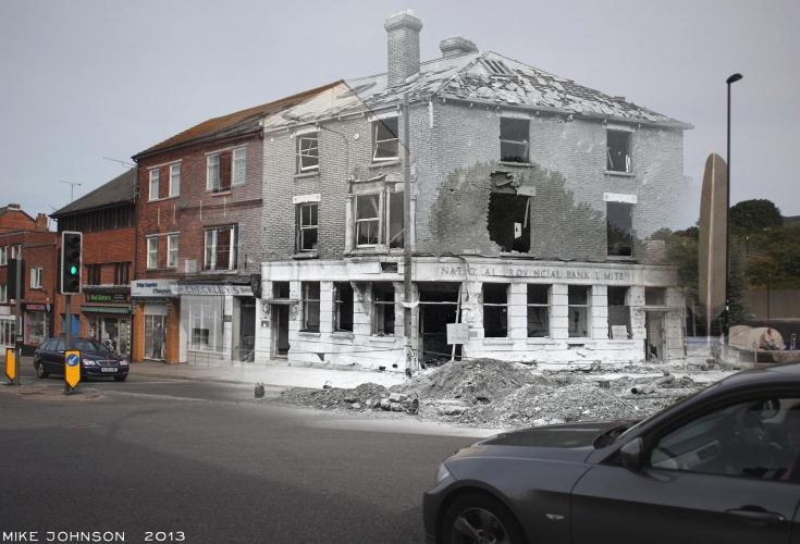 March 2019 Woolston Millennium Garden showing the bombed out National Provincial bank during the Second World War superimposed on to the present day view. |