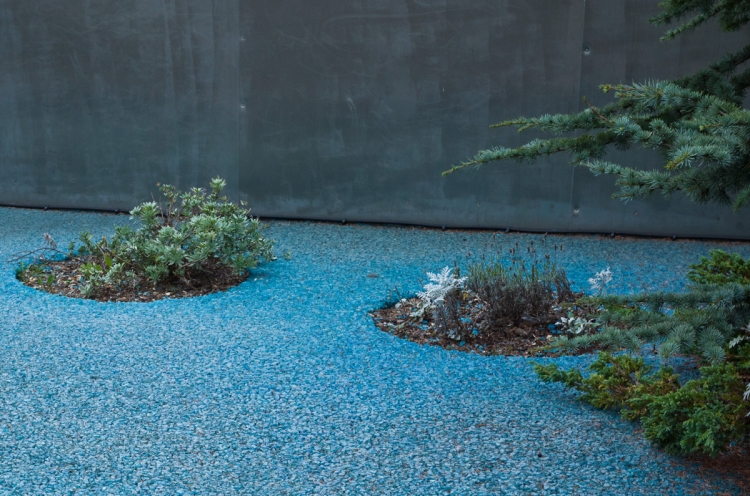 The raised garden is surfaced with recycled blue glass chips set in epoxy resin, to represent the sky, with the pale foliage plants and white pebbles giving the appearance of clouds. The two tall pine trees have exceeded all expectations and are certainly reaching for the sky.