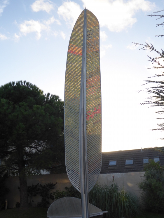 The 10m high feather sculpture was fabricated by Vosper Thorneycroft in the local shipyard (now the site of Centenary Quay) and is constructed from stainless steel with inserts of recycled coloured glass chips, set in epoxy resin. The glass was sourced from a huge variety of every day objects, including car brake lights and wine bottles. The glass was crushed by members of the building committee, using sledge hammers and an old dustbin! The feather is the focal point of the garden and it’s theme of “Flight and Float”. It also represents peace and friendship and is three-dimensional so that it can be seen as a feather from any direction.
